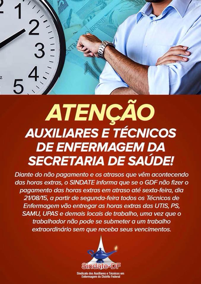 heO Sindicato dos Auxiliares e Técnicos em Enfermagem (Sindate-DF), por sua vez, sugeriu que os técnicos em enfermagem das Unidades de Terapia Intensiva (UTIs), Prontos-socorros (PSs), Serviço de Atendimento Médico de Urgência (SAMU), Unidades de Pronta Atendimento (UPAs) e das demais unidades de saúde ‘entregassem’ [ao banco de horas] as horas-extras, caso o GDF não efetue o pagamento dos valores devidos, até a próxima sexta-feira (21/Ago).