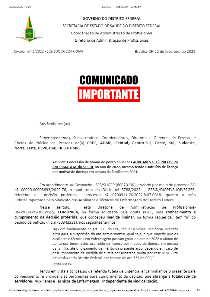 Nesta terça-feira (22/02) foi publicada a circular n° 03/2022 que libera a concessão do Abono de Ponto anual aos servidores em 2022, mesmo que tenham se ausentado por motivo de doenças em pessoas da família em 2021