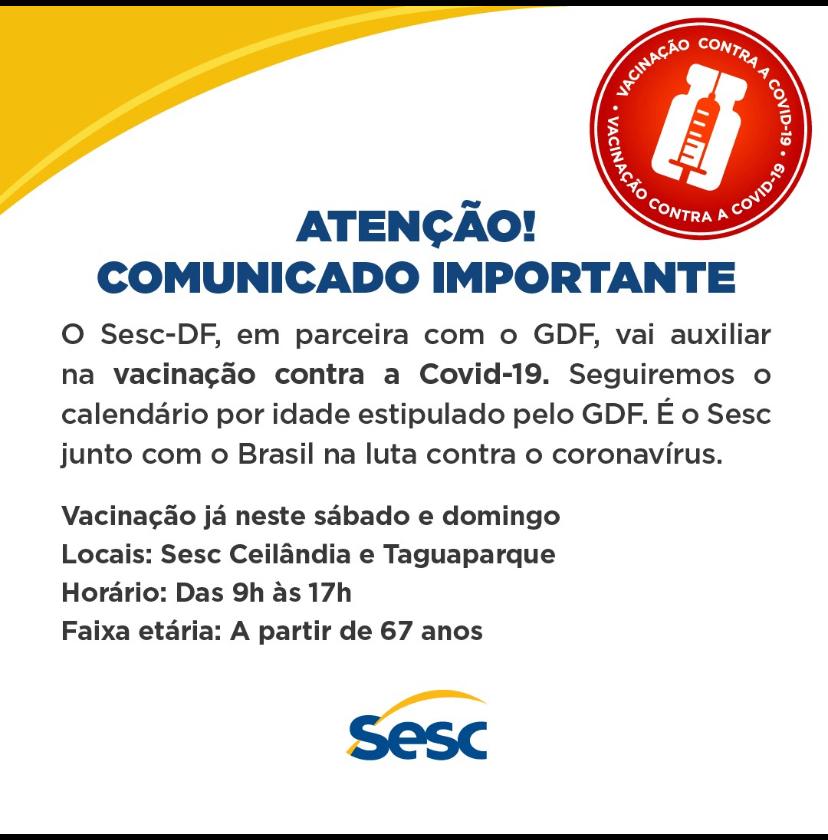 O Sesc-DF, por meio de parceria com o Governo do Distrito Federal, passa a aplicar vacinas contra Covid-19 a partir deste sábado, das 9h às 17h, na Unidade do Sesc em Ceilândia e no Taguaparque. A aplicação das vacinas será na modalidade drive-thru e funcionará já neste sábado e domingo.