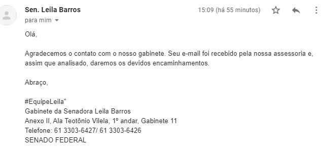 Em uma resposta automática o gabinete da senadora informa que irá analisar. Veja: