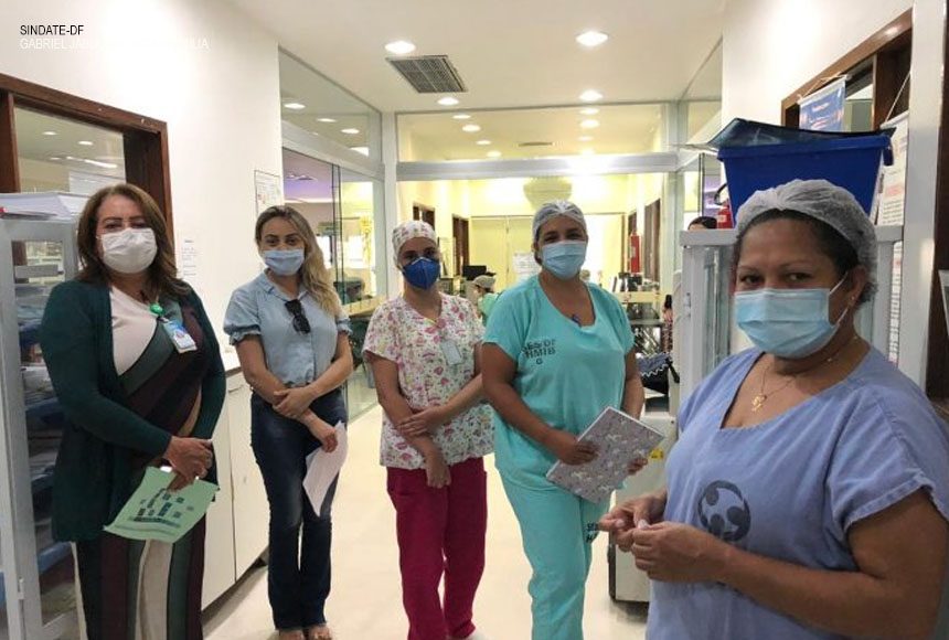 A inspeção do Sindicato dos Auxiliares e Técnicos em Enfermagem do DF (Sindate-DF) esteve no Hospital Materno Infantil de Brasília (HMIB), na última segunda-feira (08/06), para averiguar as condições das medidas adotadas no enfrentamento à Covid-19 e no fornecimento dos Equipamentos de Proteção Individual (EPIs).