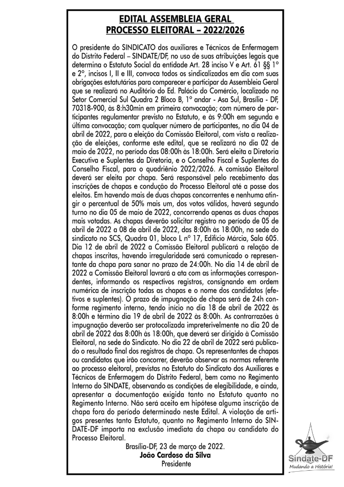 O Sindicato dos Auxiliares e Técnicos em Enfermagem do Distrito Federal (Sindate-DF) convoca todos os seus filiados para participarem da Assembleia Geral que elegerá a Comissão Eleitoral, no dia 4 de abril de 2022, a partir das 8h30.