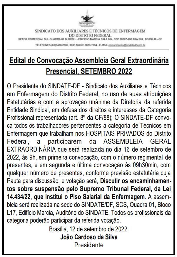 A diretoria do Sindicato dos Auxiliares e Técnicos em Enfermagem do Distrito Federal (Sindate-DF) convoca os profissionais que trabalham na rede privada de saúde para participar da Assembleia Extraordinária que será no dia 16 de setembro, a partir das 9h.