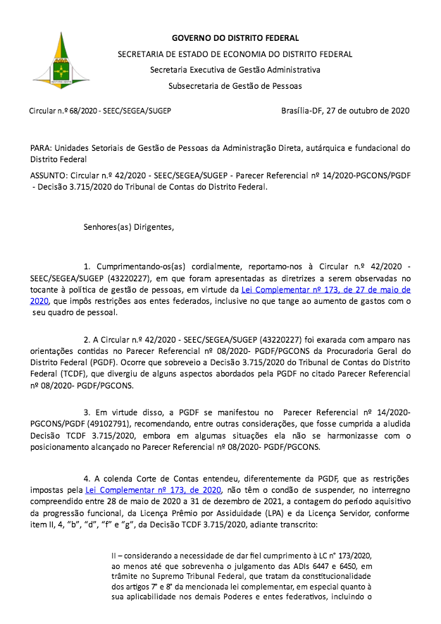 A mesma está amparada nas orientações contidas no parecer referencial nº 08/2020- PGDF/PGCONS. Que trata das suspensões de benefícios de qualquer natureza para os servidores. Porém, a PGDF orientou aos gestores que seguissem o entendimento do Tribunal de Contas do Distrito Federal (TCDF).