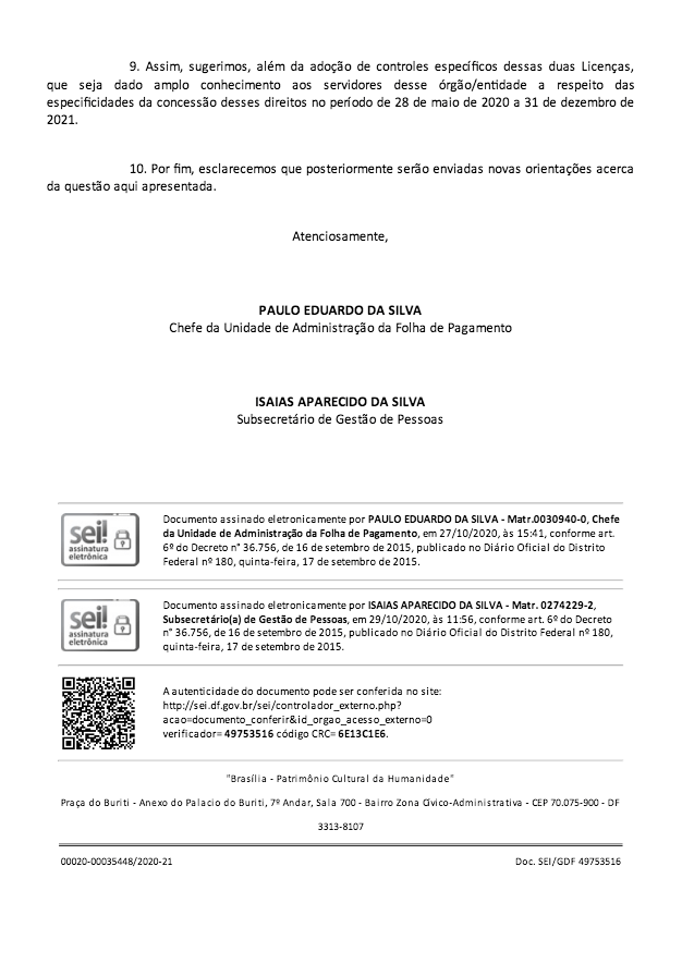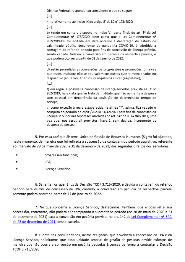 O TCDF por meio da decisão 3715/2020, admite a contagem de tempo de serviço para a concessão de licença prêmio, sendo vedada a conversão em dinheiro. Esta conversão só poderá ser feita a partir de 1° de janeiro de 2022. E a mesma decisão compete a licença servidor. Estão permitidas também as concessões de progressões e promoções. Caso o servidor tenha direito a progressão ou as licenças citadas acima, deverá solicitar através de requerimento via SEI.