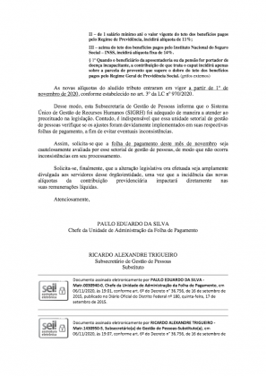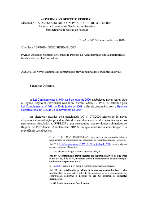 Em circular n.º 69/2020 – SEEC/SEGEA/SUGEP publicada no dia 06/11, a secretária reforça que a partir da folha de pagamento do mês de dezembro, serão descontados novos valores referentes a reforma da previdência. A porcentagem paga pelo servidor antes da decisão, era de 11% e agora chegou em até 14%.
