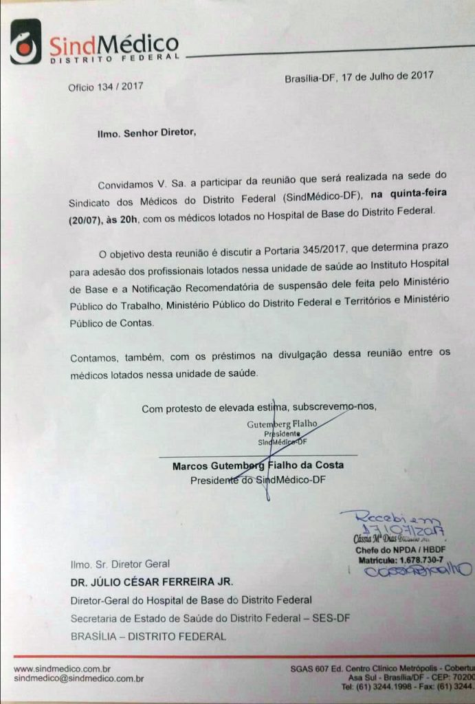 O Sindicato dos Médicos do DF (SINDMÉDICO-DF) convocou os profissionais que atuam na Secretaria de Estado de Saúde do DF (SES-DF)(17/Jul), lotados no Hospital de Base do DF (HBDF) para discutir a Portaria 345/2017, que trata da ‘adesão’ dos servidores ao Instituto HBDF. A pauta de discussão inclui, também, a recente recomendação de anulação da Portaria, por parte dos ministérios públicos do DF e Territórios (MPDFT), do Trabalho (MPT) e de Contas do DF (MPC-DF).