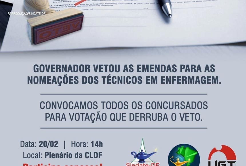 Na terça-feira (20/Fev), os sindicatos dos Auxiliares e Técnicos em Enfermagem do DF (SINDATE-DF) e dos Enfermeiros do DF (SINDENFERMEIROS-DF), realizam atos na Câmara Legislativa do DF (CLDF) para pressionar os deputados distritais à derrubarem vetos do governador do DF, Rodrigo Rollemberg (PSB), para novas nomeações na Secretaria de Estado de Saúde do DF (SES-DF).