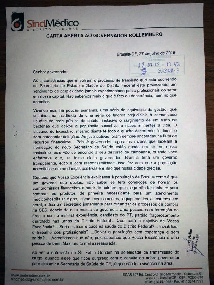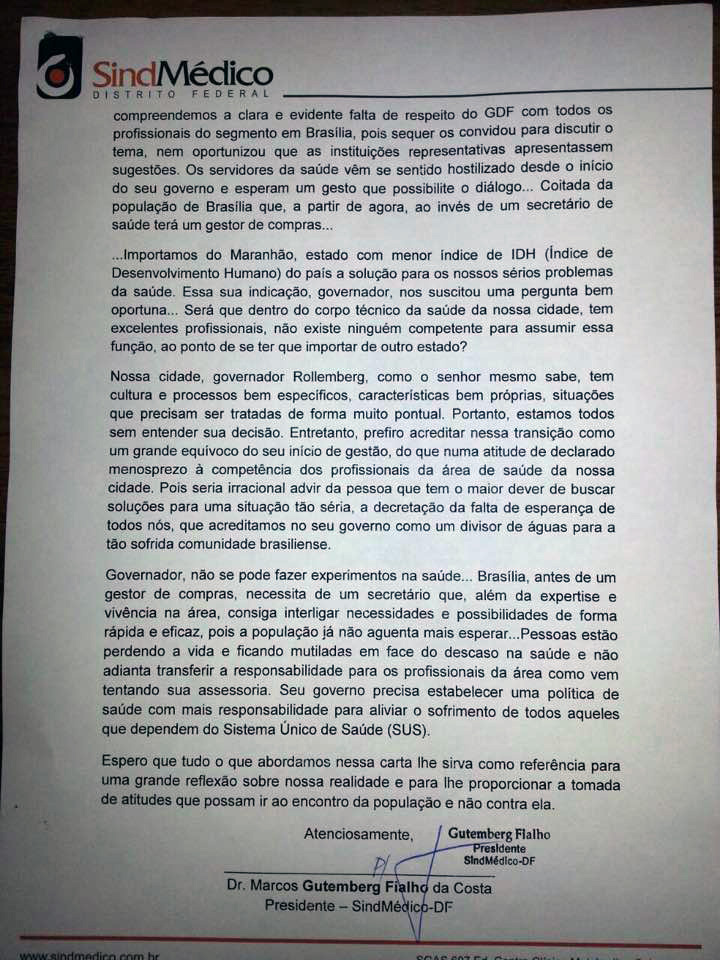 “Gostaria que Vossa Excelência explicasse à população de Brasília como é que um governo que declara não saber se terá condições de honrar os compromissos financeiros a partir de outubro, que alega não ter dinheiro para comprar os produtos de primeira necessidade para um atendimento médico/hospitalar digno, como medicamentos, equipamentos e insumos em geral, indica um secretário justamente para organizar os processos de compra na SES, depois de sete meses de governo…  Uma pessoa sem formação na área e sem a mínima experiência, candidato do PT, partido fragorosamente derrotado nas urnas do Distrito Federal… Qual será o objetivo de Vossa Excelência? Seria instituir o caos na saúde do Distrito Federal? Inviabilizar o trabalho dos profissionais? …Deixar a população sem esperança e sem saída? … Acreditamos que não, pois sabemos que Vossa Excelência é uma pessoa de bem. Mas, muito mal assessorada.”.