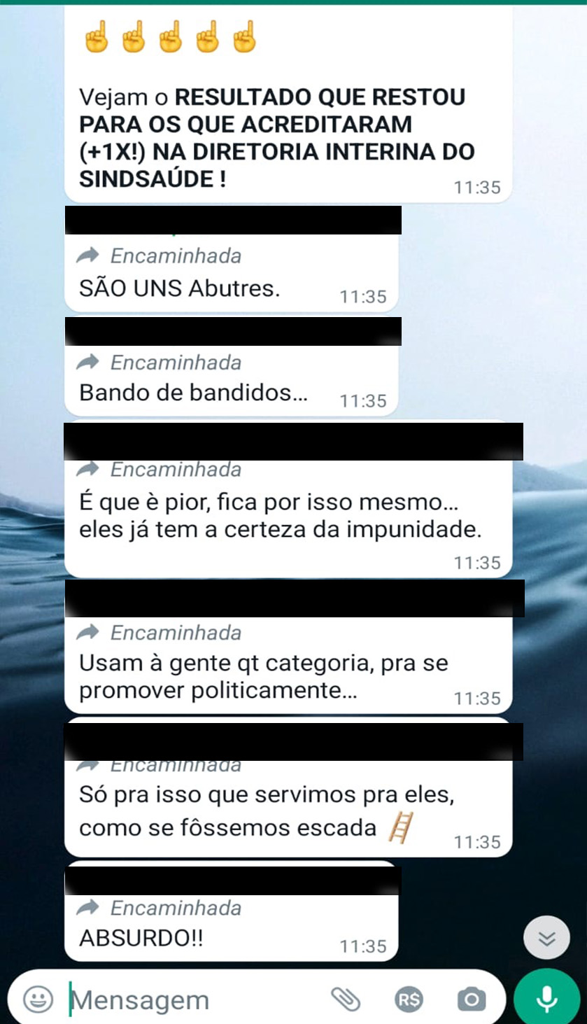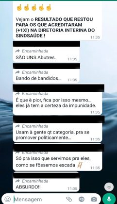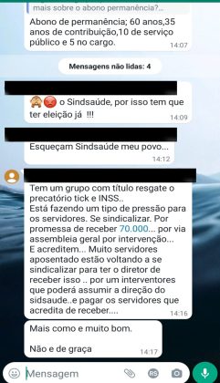 “Hoje pela manhã, recebi uma ligação de uma assessoria dos advogados do SindSaúde. Olha só. Eles querem enviar um email para você receber um ano só de INSS ao invés de oito. Eu fiquei maluca. Aí procurei o SindSaúde e nenhum dos telefones não acertava a ligação, tudo dando como se tivesse com problema, consegui falar com um advogado agora a tarde. Aí ele disse: ‘- Não que essa empresa é terceirizada, ela é que faz esse trabalho por fora.’ Ai falei. Dr. Rodrigo. Isso é 171, igual fizeram com o tíquete alimentação, igual eu, tinha quase R$ 8 mil e e ganhei R$ 3 mil. Então estou fora e vou mobilizar o máximo de gente que eu tenho de gente que eu tenho conhecimento, para não entrar nessa. Aí ele disse que vai mandar o email para vocês, para ver as duas sugestões deles. Sei que uma é essa. Se quiser pegar um ano, você recebe. Senão os oito anos, já perdeu”, disse ao pedir que todos se unam para discutir o assunto. “Isso é errado, é roubo, tá bom, um abraço”, concluiu.