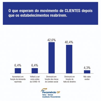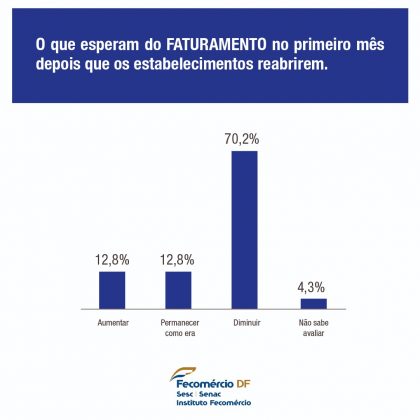 Foi perguntado aos empreendedores o que eles esperam do faturamento no primeiro mês, após a reabertura das lojas na capital do País. Ficou constatado que 70,2% esperam que a faturamento caia; 12,8% disseram que vai permanecer como era antes; 12,8% afirmaram que vai aumentar; e 4,3% não souberam avaliar. Sobre o fluxo de clientes nos estabelecimentos após a reabertura, o sentimento também não é de otimismo: 42,6% responderam que diminuirá em função dos riscos do contato social; 40,4% avaliaram que diminuirá por conta da falta de dinheiro; 6,4% disseram que vai aumentar em função da demanda reprimida; 6,4% esperam que voltará a ser como antes e 4,3% não souberam opinar.