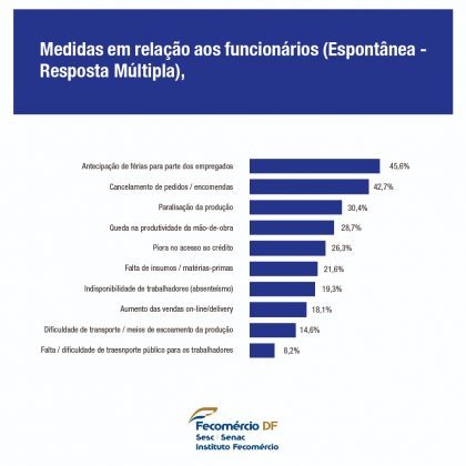 Em um questionário de múltipla escolha, o levantamento aborda ainda quais providências as empresas estão adotando ou pretendem adotar na gestão sobre a crise: 45,6% responderam que deram antecipação de férias para parte dos empregados; 42,7% afirmaram ter reduzido a jornada de trabalho; 30,4% aderiram ao home office; 28,7% realizaram alteração em turnos de trabalho, 26,3% suspenderam temporariamente os contratos de trabalho; 21,6% deram férias coletivas e 18,1% demitiram os empregados.