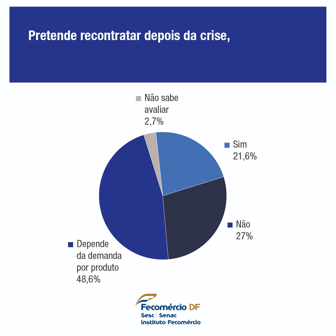 Sobre os empregos, a pesquisa mostra que 48,6% dos lojistas pretendem recontratar os funcionários, mediante aumento da demanda por produtos e serviços; 27% disseram que não vão recontratar; 21,6% afirmaram que pretendem recontratar, ainda que as vendas permaneçam estáveis, e 2,7% não souberam avaliar. O sócio da Opinião Informação Estratégica, o estatístico Alexandre Garcia diz que os empregos não terão uma retomada imediata após a abertura do comércio. “A demanda vai ditar o ritmo da volta dos empregos. Acredito que, na verdade, a retomada deve demorar, no mínimo, 6 meses. Só aí poderemos ter um termômetro para a recontratação dos colaboradores”, diz Alexandre.