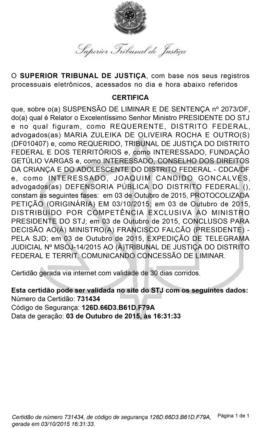 A pedido do Procuradoria-Geral do Distrito Federal , o Superior Tribunal de Justiça (STJ), na tarde deste sábado (3), suspendeu a decisão de desembargadora da 3ª Turma Cível do Tribunal de Justiça do Distrito Federal e Territórios (TJDFT). Com a decisão do ministro, Francisco Falcão, segue o processo eletivo do Conselho Tutelar do DF e a população do DF, nas urnas das 9 às 17 horas deste domingo, para escolher os novos conselheiros.