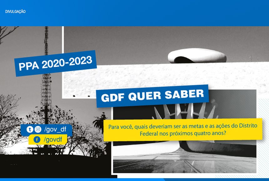 A população do Distrito Federal já pode começar contribuir com a elaboração das políticas públicas do Governo do Distrito Federal (GDF). Está aberto o período para envio de sugestões ao projeto do Plano Plurianual 2020-2023 (PPA). As propostas poderão ser feitas pela internet (www.ouv.df.go.br), por telefone (162) ou presencialmente nos postos de atendimento das ouvidorias e nas audiências públicas. As sugestões pelos canais das ouvidorias serão recebidas até dia 8 de julho.