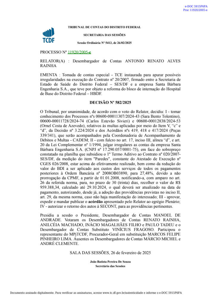 O Tribunal de Contas do Distrito Federal (TCDF) determinou que a empresa Santa Bárbara Engenharia S.A. restitua R$ 959.388,34 aos cofres públicos devido a irregularidades na execução da reforma do bloco de internação do Hospital de Base do Distrito Federal (HBDF). Esse valor ainda será atualizado monetariamente.
