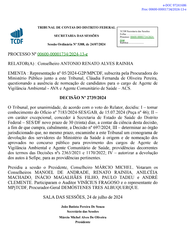 Publicação: 07/08/2024 – Alteração 08/08/2024 | Para correção de contexto, de cobrança do TCDF de cronograma de nomeações em vez de recomendação de nomeações.