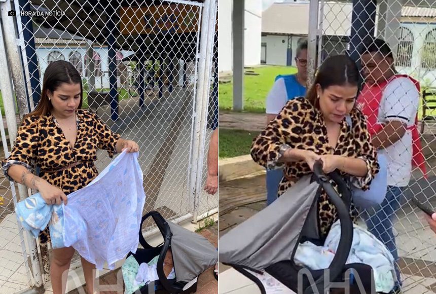 A jovem mãe não desistiu do sonho do concurso e, mesmo com seu bebê no colo e com o apoio do marido e com um bebê conforto, foi para a escola realizar a prova.
