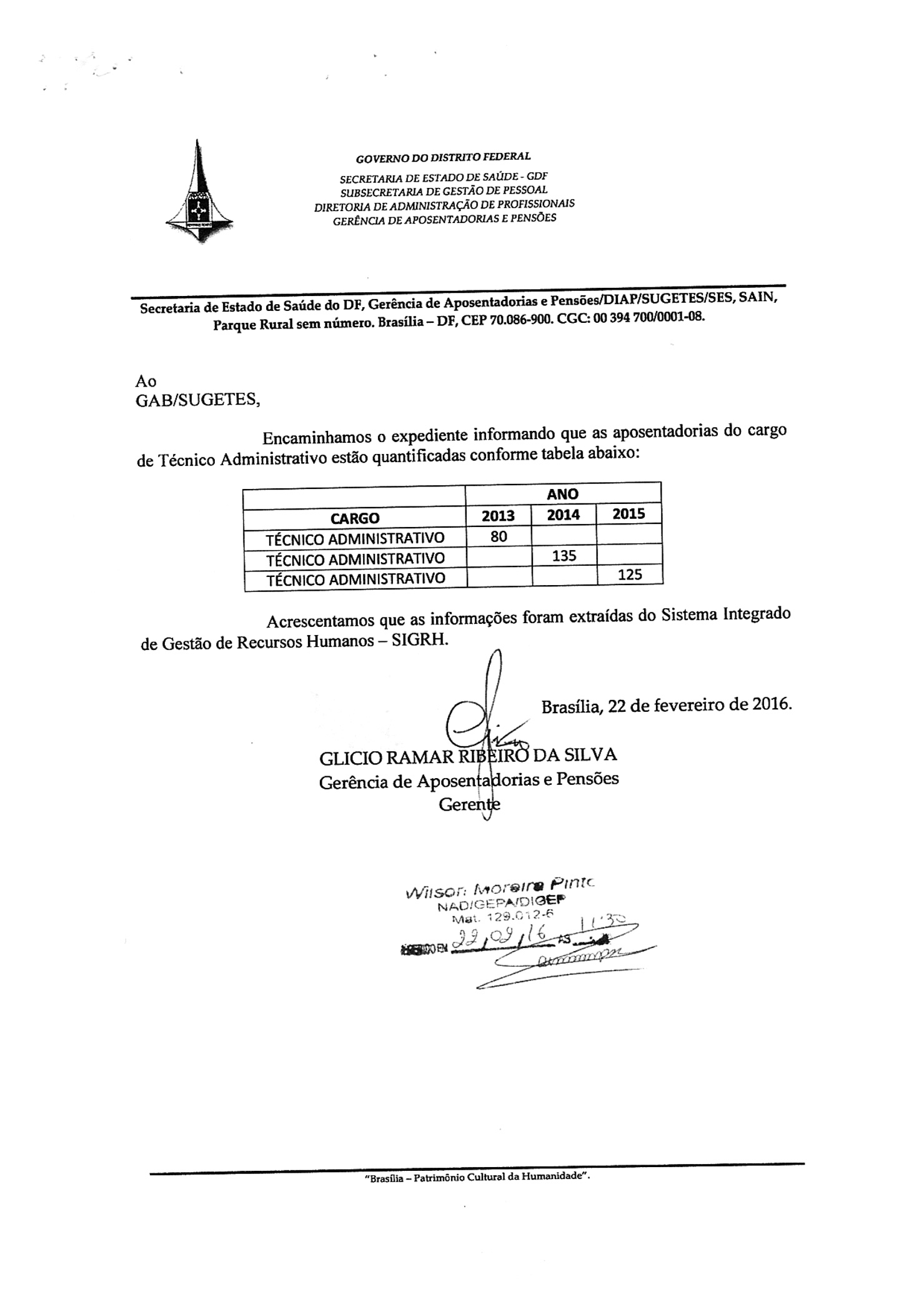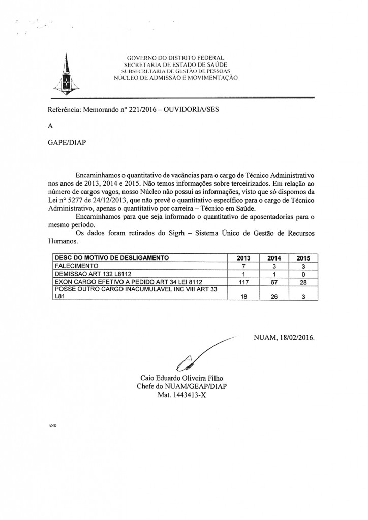 Um dos técnicos administrativos, que pede para não ser identificado, obteve por meio do Serviço de Informação ao Cidadão (E-Sic) onde são demonstradas as vagas em vacância, provenientes de aposentadorias, demissões, morte, devolução de servidores cedidos e de trabalhadores em contratos temporários. Os documentos apontam dados entre 2013 e 2015. Os questionamentos dos profissionais ocorrem em decorrência do déficit de servidores na SES-DF.