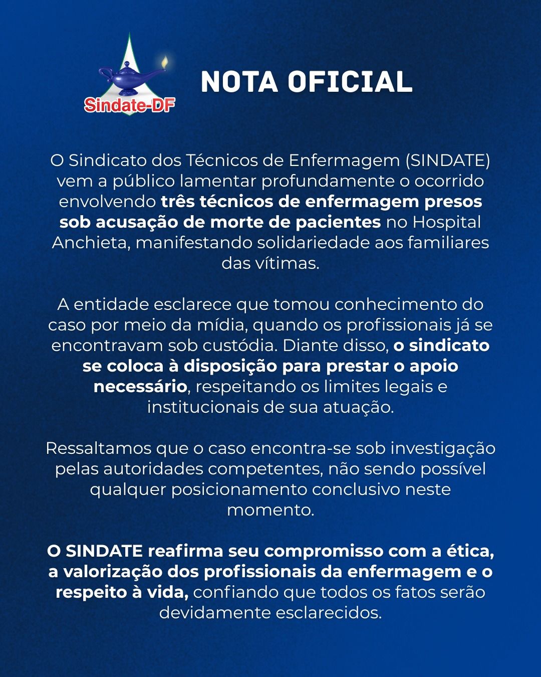 A direção do Sindicato dos Auxiliares e Técnicos em Enfermagem do DF (Sindate-DF), lamentou o episódio e se solidarizou com as vítimas, além de se colocar a disposição, para ajudar no que for necessário, dentro dos limites institucionais.