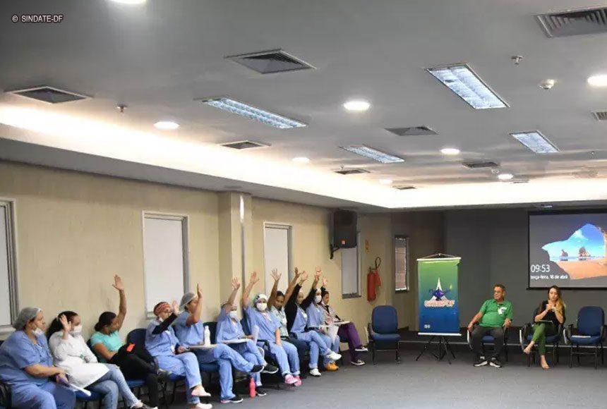 Nesta terça-feira (18/04), o Sindicato dos Auxiliares e Técnicos em Enfermagem (Sindate) realizou uma assembleia com os técnicos em enfermagem do Instituto de Cardiologia e Transplantes do Distrito Federal (ICTDF). O objetivo foi tratar do Acordo Coletivo de Trabalho referente ao retroativo da Data Bate do período de 2020 até 2023.