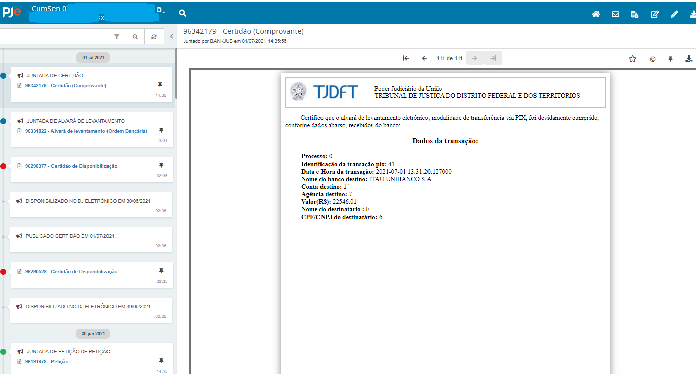 O TJDFT realizou, na tarde dessa quinta-feira, 1º/7, a primeira expedição de forma assistida de alvará de levantamento eletrônico de transferência via PIX. O procedimento foi efetivado em um processo da 23ª Vara Cível de Brasília que, ao lado da 7ª Vara Cível de Brasília, estão funcionando como serventia piloto na implantação da nova funcionalidade.