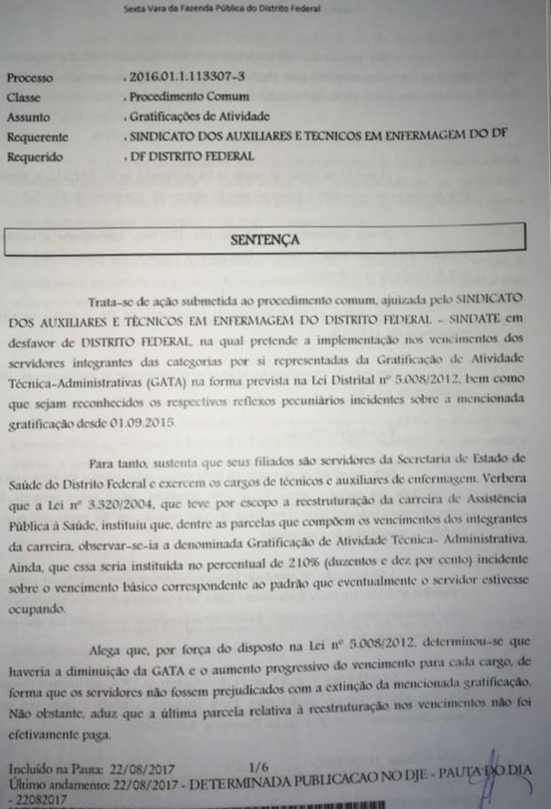 Na terça-feira (22/Ago), a juíza de Direito, Sandra Cristina Candeira de Lira, da sexta vara da Fazenda Pública do Tribunal de Justiça do DF (TJDFT) julgou procedente a ação coletiva do Sindicato dos Auxiliares e Técnicos em Enfermagem do DF (SINDATE-DF), de incorporação da Gratificação de Atividade Técnico-Administrativo (GATA).