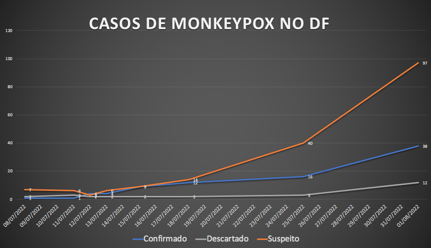 O Distrito Federal registrou o primeiro caso confirmado de infecção pelo monkeypox em 08 julho de 2022. Dados do o último boletim epidemiológico da SES-DF (01/Ago), apontam que o DF contabilizou 38 casos confirmados e 97 suspeitos e 12 descartados. Dentre os confirmados estão sete homens, com predominância nas faixas de 30 a 39 anos, com 20 pessoas e dos 20 aos 29 anos, com 14. Apenas uma mulher teve confirmação de contaminação pelo vírus.