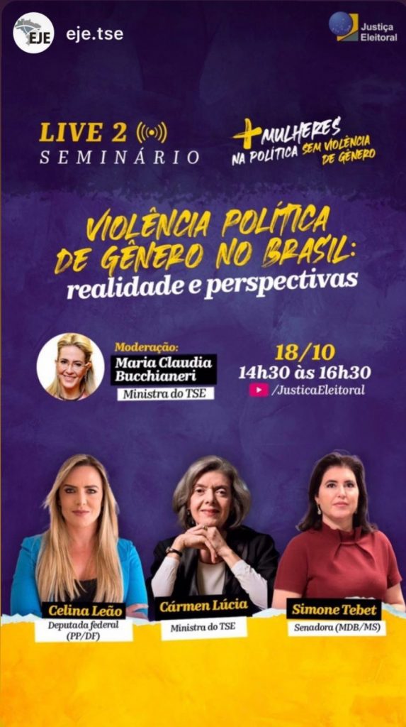 A segunda live, que começa às 14h30, debate a realidade e perspectivas da violência política de gênero no Brasil, e conta com Cármen Lúcia, ministra do Supremo Tribunal Federal; Anastasia Divinskaya, representante da ONU Mulheres; Celina Leão, deputada federal e coordenadora da Secretaria da Mulher; Simone Tebet, senadora e líder da bancada feminina no Senado Federal; Renata Gil, presidente da Associação dos Magistrados Brasileiros; e Lívia Santana Vaz, procuradora do Ministério Público da Bahia.