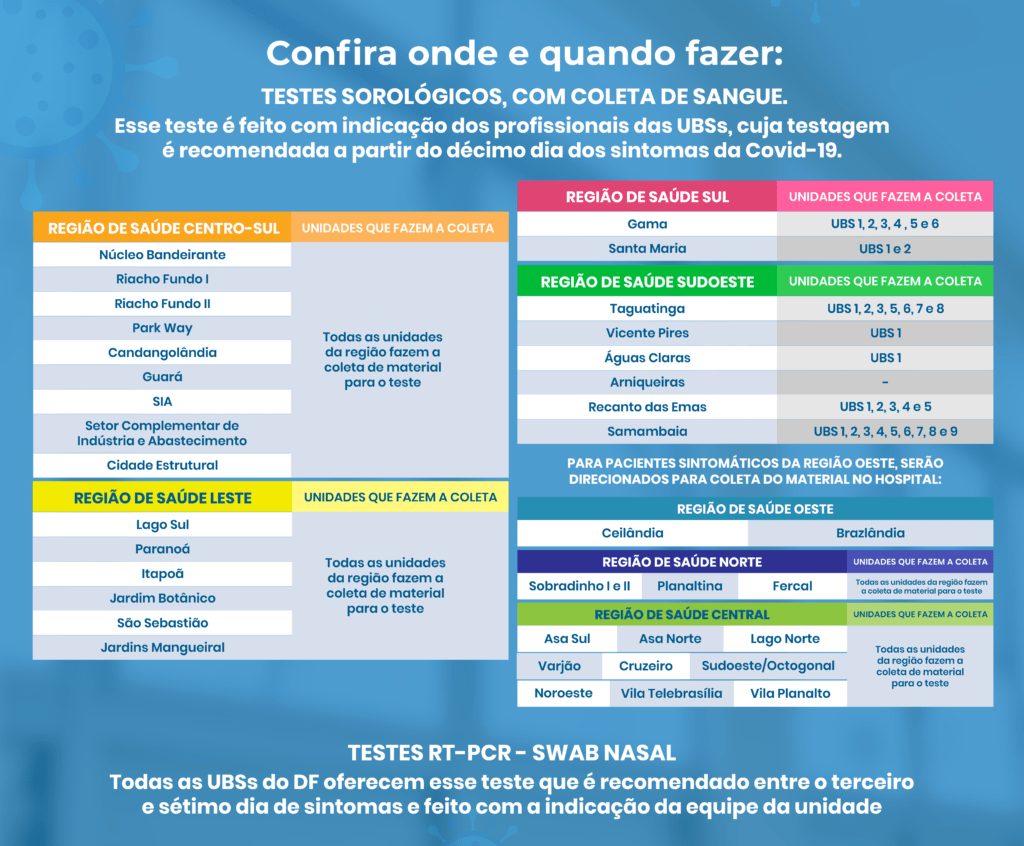 As unidades da rede pública de saúde do Distrito Federal dispõem de dois tipos de testes para detectar a Covid-19: o RT-PCR (swab nasal), considerado pelos especialistas a técnica padrão-ouro no diagnóstico da doença, e o sorológico, que detecta anticorpos IgM em plasma ou soro. Os dois testes são feitos em pessoas que apresentam sintomas da Covid-19.