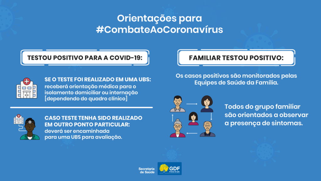 Quem tiver sintomas da Covid-19 e residir em Ceilândia ou Brazlândia deve procurar a UBS mais próxima de sua casa onde será atendido, avaliado e, caso necessário, poderá ser encaminhado para fazer o teste na UPA ou hospital.
