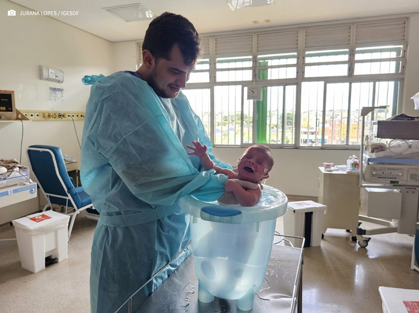 “Os recém-nascidos, principalmente os prematuros, não estão acostumados com tantos estímulos que recebem aqui fora. Por isso, priorizamos dar o banho nos bebês da UCIN, pois já são um pouco maiores e geralmente, receberam muitos estímulos dolorosos no período em que estiveram na UTI neonatal. Com isso, são mais sensíveis e agitados”, explica o terapeuta ocupacional da UCIN, Assis Rodrigues.
