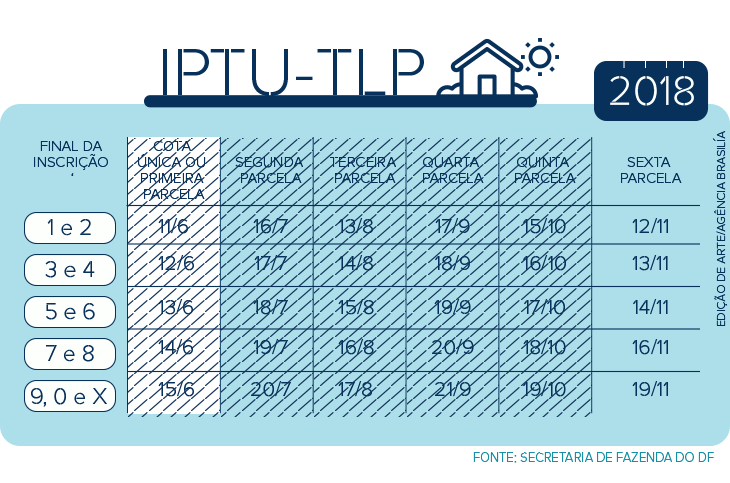 Na segunda-feira (12), começa a vencer a sexta e última parcela do Imposto Predial e Territorial Urbano (IPTU) e da Taxa de Limpeza Pública (TLP) 2018. Os vencimentos iniciam pelos imóveis com inscrição final 1 e 2 e seguem até 9, 0 e X.