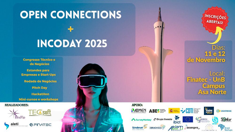 A Universidade de Brasília (UnB) sediará, nos dias 11 e 12 de novembro (11/Nov e 12/Nov), o evento “Open Connections + InCoDay”. A iniciativa, realizada em parceria com entidades como Tecsoft, BraFIP e Finatec, visa promover a junção estratégica entre tecnologia, negócios, empreendedorismo e o ambiente acadêmico. O encontro tem como objetivo viabilizar a discussão de temas relevantes, como inteligência artificial, e gerar negócios, parcerias e networking qualificado.