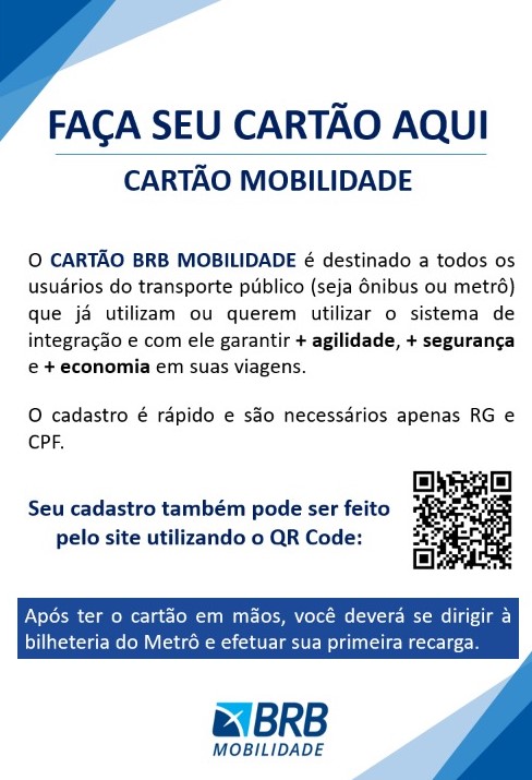 Os guichês serão exclusivos para cadastro; o cartão sai na hora e é gratuito. A recarga continua sendo feita normalmente nos demais guichês das bilheterias de todas as estações. Para realizar o cadastro, são necessários apenas dados pessoais, como endereço, a carteira de identidade e o CPF. O cadastro nas estações é temporário, mas ainda sem data definida para terminar. Importante lembrar que, além das estações, o cadastro está disponível no site do BRB Mobilidade (www.mobilidade.brb.com.br) e a recarga, pelo aplicativo, evitando filas. O acesso ao cadastro no site também pode ser feito usando o QR Code impresso nos cartazes próximos aos guichês (cópia em anexo).