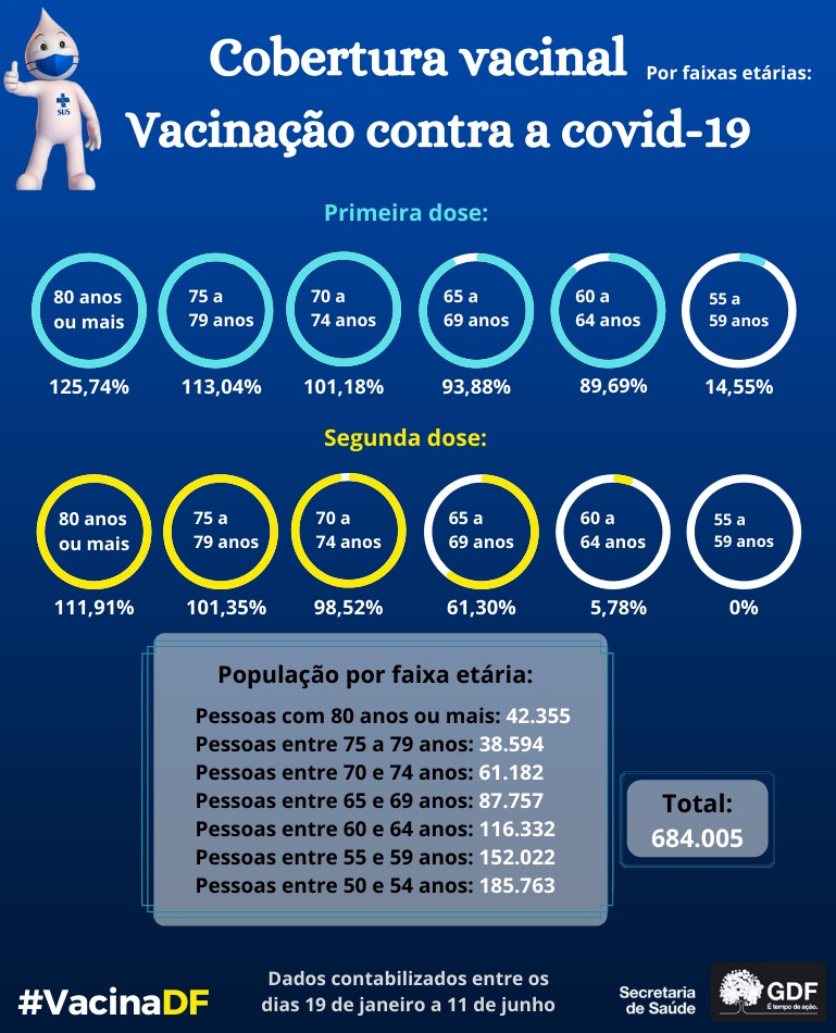 A cobertura vacinal da primeira dose entre as faixas etárias ultrapassa 100% em pessoas com 70 anos ou mais. Isso ocorre devido a pessoas de outras unidades da Federação que buscaram vacinação no DF e que não estavam previstas dentro da estimativa populacional. Com o reforço, a cobertura vacinal passa 100% em pessoas com 75 anos ou mais e chega a 98,52% em quem tem 70 a 74 anos.