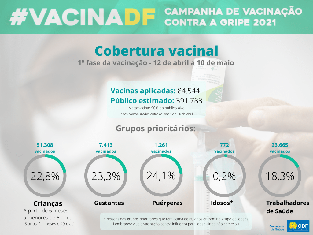 A vacina garante proteção contra os vírus influenza A H1N1 e H3N2, e influenza B. O Distrito Federal já recebeu três remessas de vacinas para a campanha. No total já foram recebidas 350 mil doses. O quantitativo restante será enviado pelo Ministério da Saúde ao longo da campanha, de forma semanal.