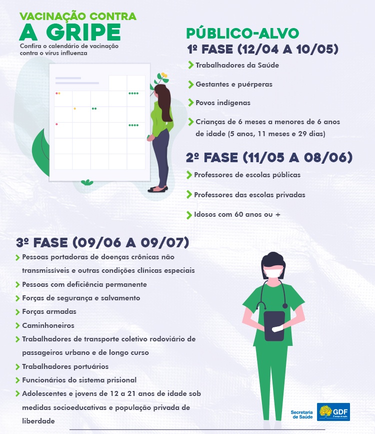 A primeira fase da 23ª Campanha Nacional de Vacinação contra influenza começou no dia 12 de abril e vai até o dia 10 de maio. A segunda fase será iniciada em 11 de maio, contemplando professores de escolas públicas e privadas, além dos idosos com 60 anos ou mais. Essa etapa vai até o dia 8 de junho. A terceira e última fase ocorrerá entre os dias 9 de junho e 9 de julho.