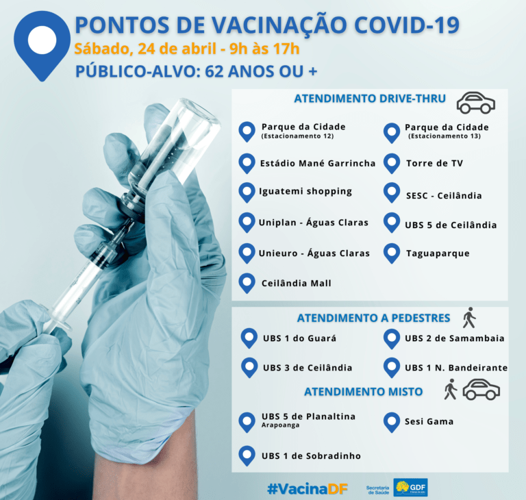 A campanha de vacinação contra a covid-19 avança mais uma etapa no Distrito Federal contemplando, a partir das 13h desta sexta-feira (23), os idosos com 62 e 63 anos. Para vacinar esse público, 52 pontos de vacinação estarão abertos até as 17h. A expectativa é vacinar 45.021 pessoas nessas duas faixas etárias, conforme estimativa da Companhia de Planejamento do Distrito Federal (Codeplan).