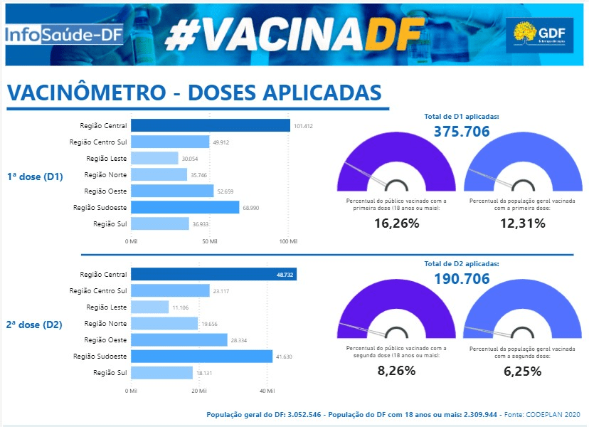 A Secretaria de Saúde divulga diariamente os dados da campanha de vacinação no Distrito Federal. As informações estão disponíveis na página Vacinômetro e indicam, até o momento, 566.412 vacinas aplicadas, sendo que 375.706 pessoas receberam a primeira dose e 190.706 receberam a segunda dose.