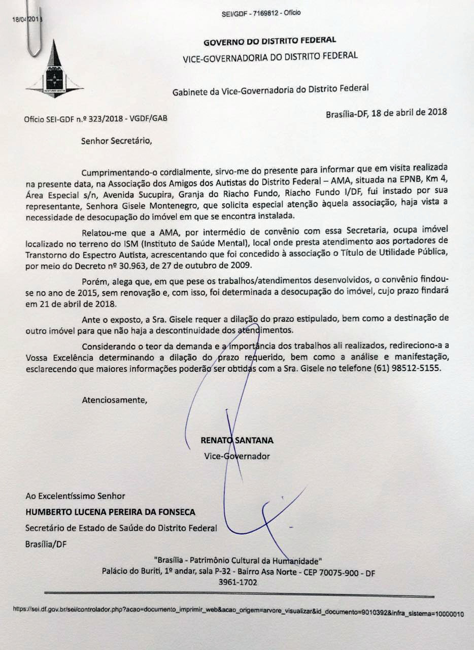 O vice-governador do DF, Renato Santana (PSD) entrou na briga para tentar garantir que a Associação dos Amigos dos Autistas do DF (AMA-DF) continue a oferecer atendimento à crianças e adultos com autismo. no Instituto de Saúde Mental (ISM). O caso ocorre após denúncia publicada por Política Distrital (PD), na quarta-feira (18/Abr) sobre a tentativa do governador do DF, Rodrigo Rollemberg (PSB) de tentar, na Justiça, inclusive com força policial, despejar a No local a AMA-DF do ISM.