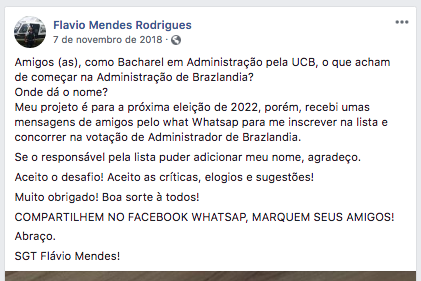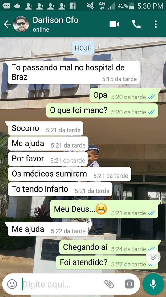 Também chama atenção uma postagem do amigo do sargento, no Facebook. Nela, Darlison Rodrigues, agradece Flavio Mendes, por tentar ajudar a garantir atendimento no HRBZ, após pedido de socorro, por meio do aplicativo Whatsapp.