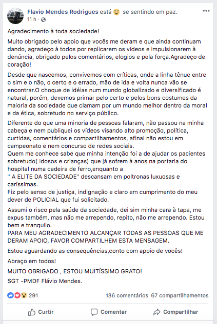 No perfil da rede social Facebook, o sargento Flavio Mendes, publicou uma nota de agradecimento às manifestações pela gravação do vídeo e de notícias que anunciavam a exoneração do diretor do HRBZ. “Fiz pelo senso de justiça, indignação e claro em cumprimento do meu dever de POLICIAL que fui solicitado. Assumi o risco pela saúde da sociedade, dei sim minha cara à tapa, me expus também, mas não me arrependo, repito, não me arrependo. Estou bem e tranquilo.”.